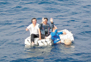 三名船員坐在浮墊上在海上漂流11小時(shí),船長(zhǎng)徐東誠(chéng)(右)為了穩(wěn)住浮墊,半身浸在海水中。(聯(lián)合晚報(bào)圖)