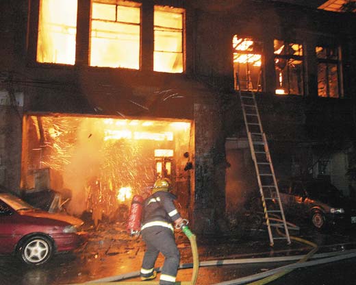 臺北市迪化街12日清晨發(fā)生一起火警,猛烈的火勢瞬間讓木造樓房陷入火海,造成兩戶擁有百年歷史的古建筑付之一炬。(聯(lián)合晚報圖)