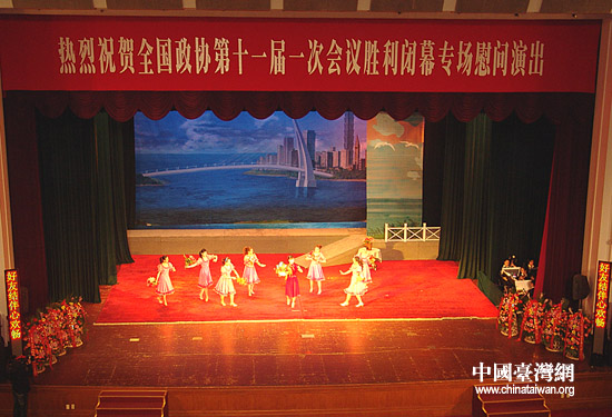 中國(guó)臺(tái)灣網(wǎng)3月16日北京消息 以反映海峽兩岸京劇梨園世家文化藝術(shù)交流、情感交織為主線的大型現(xiàn)代京劇《海上生明月》昨晚在全國(guó)政協(xié)禮堂演出。全國(guó)政協(xié)副主席孫家正、國(guó)臺(tái)辦副主任孫亞夫、海協(xié)會(huì)副會(huì)長(zhǎng)張銘清等觀看了演出。