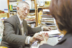 高齡99歲的臺(tái)灣老中醫(yī)師姜通目前還在看診,問診相當(dāng)謹(jǐn)慎仔細(xì)。身為家族第十代中醫(yī)的他,到現(xiàn)在還用毛筆寫處方。(臺(tái)灣《中國時(shí)報(bào)》圖 姚志平攝)