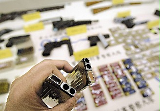 臺北市警方破獲“北聯幫”臺北總會軍火庫,查獲各式槍枝,其中打火機型手槍甚為罕見。(臺灣《聯合報》圖片)