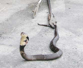 前天消防局宜蘭分隊抓蛇時,林碧云先買青蛙誘蛇出來,消防隊員趕緊用捕蛇夾挾住,眼鏡蛇昂首吐信,模樣嚇人,隊員當晚即將其放生。