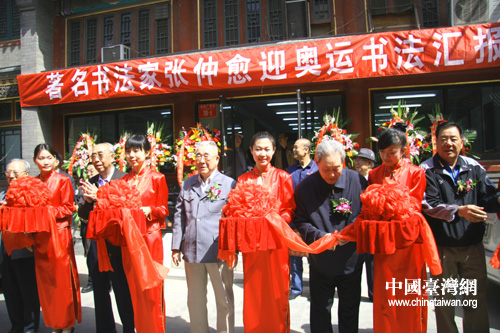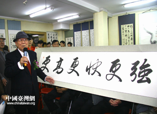 中國臺灣網5月8日北京消息 今天上午10點,正值北京奧運圣火首次登上地球之巔珠峰之際,當代著名書法家張仲愈先生的迎奧運書法匯報展在北京榮寶齋開幕。開幕式上,張仲愈先生向北京奧組委捐贈大幅作品“同一個世界 同一個夢想”和一副六尺楹聯 “奧運雄風健兒名揚四海;中華盛世英雄功耀九州”;向國際奧委會主席羅格先生贈送一副8尺橫幅作品“更快、更高、更強”。