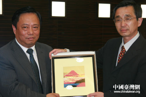 全國(guó)臺(tái)聯(lián)會(huì)長(zhǎng)梁國(guó)揚(yáng)出席捐款儀式,并和日本神戶中華同文學(xué)校互換禮物。(攝影:鐘寶華)