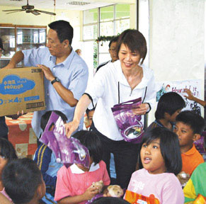 周美青向小朋友發放小熊玩具及餅干。來源:臺灣《聯合報》