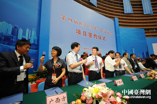 2007年,第三屆桂臺經貿合作交流會上,桂臺雙方共簽約項目62個,總投資約6.85億美元,臺商出資額約 6.12億美元,占89.3%。其中,合同項目41個,合同總投資約4.2億美元,合同臺商出資額約3.49億美元; 簽約合同項目占總簽約項目的66%,臺資占投資總額的82.9%。協議、意向項目21個,協議、意向總投資約 2.65億美元,協議、意向臺商出資額約2.63億美元。62個項目中,制造業項目36個,總投資約2.38億美元 ,臺商出資額約2.3億美元,分別占58%、34.7%、37.6%。在簽約的62個項目中,投資總額在1000萬美元以 上的項目有19個,占簽約項目的30.6%。簽約項目中有農業、水產畜牧項目11個,制造業項目36個,基礎 設施、房地產及服務項目15個。簽約數量、項目規模、項目分布及質量明顯好于2006年。