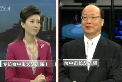 臺中市長胡志強接受中央電視臺《海峽兩岸》主持人李紅的專訪。(圖片來源:電視截圖。)