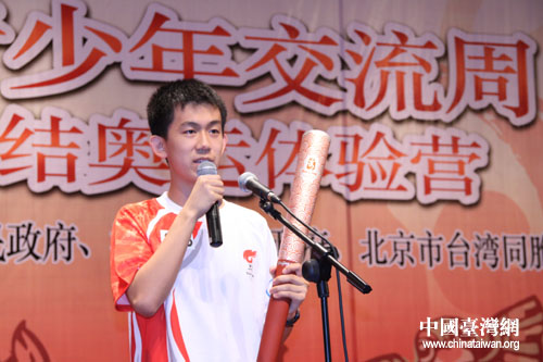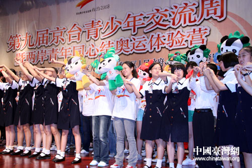 開幕式上,京臺兩地學(xué)生用精彩的文藝節(jié)目來表達(dá)兩岸青少年歡聚北京、共慶奧運(yùn)的喜悅之情,北京四中奧運(yùn)火炬手李昕旸同學(xué)還在現(xiàn)場與臺灣同學(xué)分享圣火傳遞的難忘經(jīng)歷。
