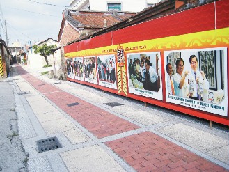 陳水扁老家巷道連小販都不見(jiàn)了,只見(jiàn)宣揚(yáng)“政績(jī)”的廣告牌。