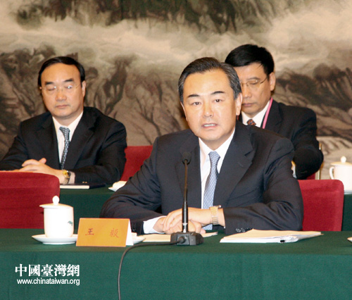 2008年臺(tái)商座談會(huì)28日上午在北京人民大會(huì)堂舉行。國(guó)務(wù)院副總理王岐山和國(guó)務(wù)院20多個(gè)主要部門(mén)負(fù)責(zé)人及60多位臺(tái)灣工商界人士、大陸臺(tái)商代表參加座談。圖為中共中央臺(tái)辦、國(guó)務(wù)院臺(tái)辦主任王毅在主持座談。(中國(guó)臺(tái)灣網(wǎng) 田云鵬 攝)