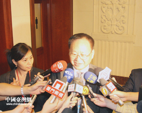 2008年臺商座談會28日上午在北京人民大會堂舉行。國務院副總理王岐山和國務院20多個主要部門負責人及60多位臺灣工商界人士、大陸臺商代表參加座談。圖為全國臺灣同胞投資企業聯誼會會長張漢文在會場外接受媒體采訪。(中國臺灣網 田云鵬 攝)