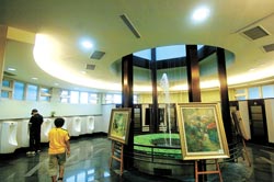 廁所內設計有噴水池,還播放音樂,游客欣賞藝術畫作,一旁有男士“解放”,整個場景顛覆傳統,帶給人相當新奇、另類的感受。“在廁所開畫展!”紫南宮管委會宣稱這是島內第一遭,在世界上恐怕也是相當罕見。