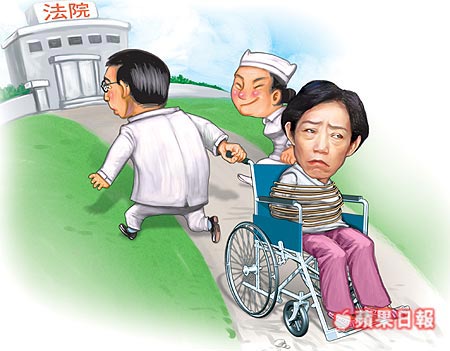 公務(wù)機(jī)要費(fèi)案本周五將再度開庭,法院請求醫(yī)院支持吳淑珍到庭所需的醫(yī)療設(shè)備及醫(yī)護(hù)人員,以備不時(shí)之需。圖為臺灣《蘋果日報(bào)》漫畫
