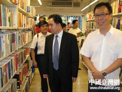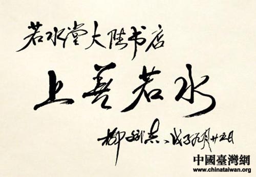 中國臺灣網9月27日消息 紀念海峽兩岸出版交流20年系列活動大陸代表團團長、新聞出版總署署長柳斌杰一行,9月25日上午赴若水堂大陸圖書高雄店參訪,柳斌杰署長親切會見了若水堂董事長宋東文并與之進行座談。宋東文對現階段臺灣地區簡體字圖書進口銷售經營現況進行了簡報。會見后,柳斌杰署長揮毫為若水堂題字:“上善若水”。
