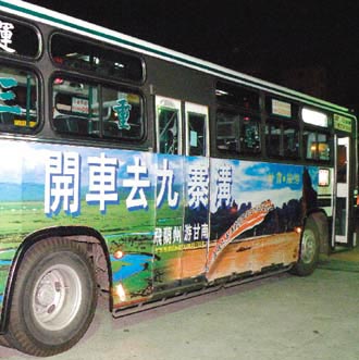 臺北縣三重客運公交車的車體廣告,出現用介紹四川九寨溝的旅游信息。臺灣《聯合報》圖