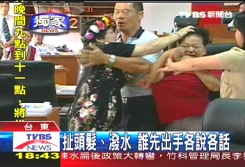 中國臺灣網10月29日消息 據臺灣媒體報道,臺灣臺東市今天召開市民代表大會,一名女代表余梅香發言不滿市公所的人事任用,遭到另一名女代表賴秀星抗議。2人開始只是言語挑釁,最后不但互扯頭發,還叫罵潑水,旁人頻頻勸阻,但是無法阻止2人沖突。