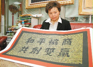 據指出,這些由書法家詹秀蓉創作的大字,其實是反白的鏤空書法,大字的四周寫滿了將近6千個小金字,每個字1立方厘米大小。密密麻麻的小字鏤出的空白正是“和平協商,共創雙贏”8個大字,6千個小金字的內容則是“陳江會談”完成的“海峽兩岸包機會談紀要”與“海峽兩岸關于大陸居民赴臺灣旅游協議”兩份文件。