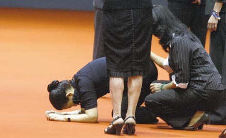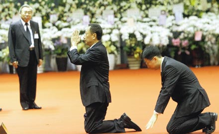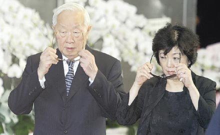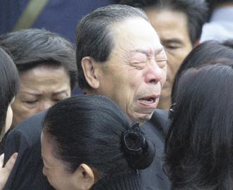 王永慶夫人李寶珠在靈堂前行跪拜大禮,思念丈夫的情緒與淚水一起宣泄。圖:臺灣《聯(lián)合報》