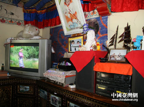 家中擺著一家人去日喀則江孜旅游時在白居寺的合影,他的兒媳婦在一旁介紹,四年前家里包了一輛中巴,去江孜旅游。女婿還指指旁邊小一點的照片說:“這是去林芝拍的,我們還去內地旅游,北京、上海都去過了。” 現在老人腿腳不好,不能經常出去了,平時只能通過看電視了解外面的事,“老人喜歡看藏語電視,聽得懂,可以知道好多事,也很高興。”