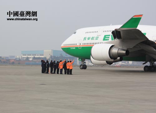 12月23日,成都雙流機(jī)場,搭載贈(zèng)臺(tái)大熊貓“團(tuán)團(tuán)”、“圓圓”和珙桐樹苗的臺(tái)灣長榮專機(jī)準(zhǔn)備起飛,機(jī)場地面工作人員揮手與專機(jī)告別。中國臺(tái)灣網(wǎng) 田云鵬 攝