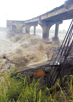 后豐大橋橋斷造成命案,斷橋后溪水仍猛烈沖擊。(臺灣《中國時報》圖片)