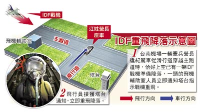 就在江姓營長座車穿越主跑道時,剛好有架IDF戰(zhàn)機(jī)準(zhǔn)備降落,塔臺正要導(dǎo)引戰(zhàn)機(jī)下降時,接到飛機(jī)輔助室通知跑道上有車,才緊急要求戰(zhàn)機(jī)重飛,并要求負(fù)責(zé)跑道導(dǎo)引的導(dǎo)引憲兵車駛離。