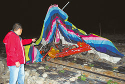 摔落南瓜園中的動力滑翔翼已經扭曲變形,不過還可看出是用三角翼支撐,載具下還有可以滑行的輪子。(來源:臺灣《中國時報》)