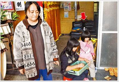 圖為被凍死者湯福泉妻兒。湯福泉為把棉被留給妻兒蓋,自己睡在沙發上(箭頭處)不幸凍死。(圖片來源:臺灣“蘋果日報”)