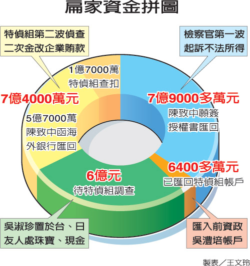 昨天庭訊中,審判長蔡守訓特意詢問特偵組,目前起訴的不法所得是否不包括“7億4000萬元”,檢察官也清楚表示“不包括”;而在庭訊中,陳致中的律師葉大慧也提到,扁家放在銀行保險室的錢,搬運前“可能有10余億元”,顯示還有數(shù)億元待追查。