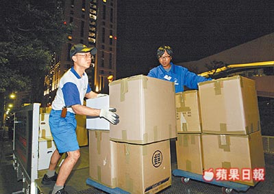 昨夜在陳水扁臺北寶徠花園廣場住家附近,搬家工人將一箱箱貨品搬上車,分析應是陳致中搬家。來源:臺灣《蘋果日報》