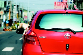 臺灣南投市彰南路前天出現一輛紅色轎車,女司機抱著狗坐在駕駛座,狗兒還探頭車窗外,讓路人以為是狗在開車。來源:臺灣《聯合報》
