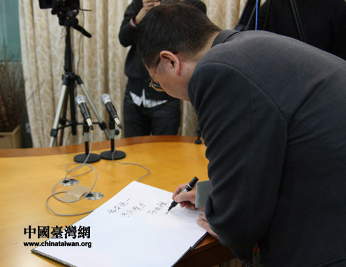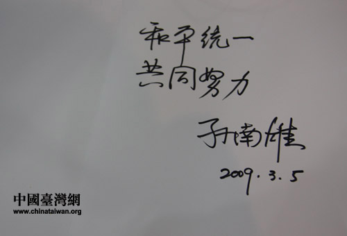 采訪結束后,孫南雄欣然在留言本上留言:和平統一、共同努力