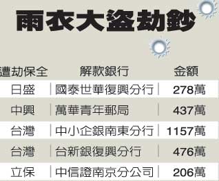 專案小組比對去年臺灣萬華青年郵局、臺灣中小企銀南東分行、臺新復(fù)興分行及2002年中信證券公司等四件運(yùn)鈔保安遭槍擊劫鈔案,發(fā)現(xiàn)歹徒都是利用下雨天、穿雨衣作掩護(hù),戴安全帽遮住容貌,逼近保安就開槍恫嚇行搶。