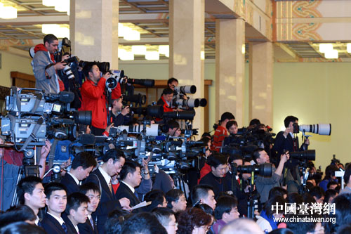 溫家寶總理與中外記者見面會,現(xiàn)場攝影記者云集。(鐘寶華 攝)