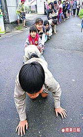許多小學生由老師陪同鉆轎底,希望功課進步、身體健康。來源:臺灣《蘋果日報》