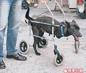 臺北市劉姓婦人得知后,捐出一部市價2萬元新臺幣的美國制狗輪椅,“暴龍”昨由獸醫師裝上輪椅,重獲行動自由,興奮得四處亂跑。(高大林)