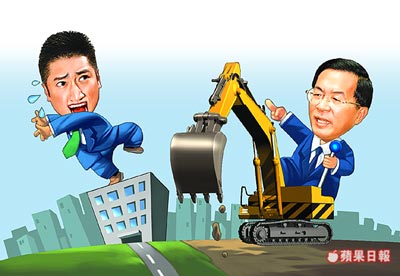 辜仲諒昨天出庭作證坦承陳水扁當臺北市長時,收到通知住家前面要開路,擔心挖土機直接開進家里,只好開始捐錢給陳水扁夫婦。臺灣《蘋果日報》漫畫