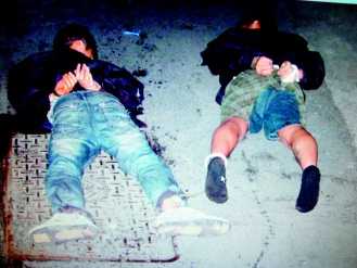 警方在兇宅外制伏兇嫌,兩人手上和地下都是死者的血。(圖片來源:臺灣《聯合報》)