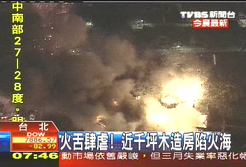 中國臺灣網4月23日消息 據臺灣TVBS電視臺報道,今天凌晨臺北市承德路上一棟木造房屋突然起火,一整排將近3000平方米的房屋都遭大火波及。所幸沒造成當地居民傷亡。
