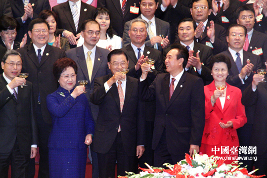 陳云林與江丙坤舉杯慶祝成功簽署三項協(xié)議。26日下午,海協(xié)會會長陳云林與臺灣海基會董事長江丙坤在南京紫金山莊簽署《海峽兩岸空運補充協(xié)議》、《海峽兩岸金融合作協(xié)議》、《海峽兩岸共同打擊犯罪及司法互助協(xié)議》。(中國臺灣網(wǎng) 鐘寶華 攝)