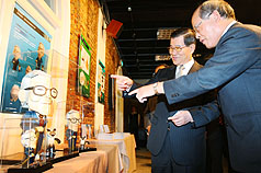蕭萬長(左)參觀柏楊公仔等周邊商品。