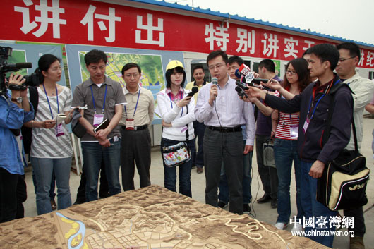 北川新城地址上,北川縣副縣長賀旺為兩岸媒體介紹北川新城規(guī)劃建設(shè)情況。(中國臺灣網(wǎng) 鐘寶華 攝)