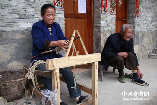 “吉娜”羌寨里的老夫妻,震前種地為生,現在搬進新居,手工制作鞋子來賣給游客,老伴還試穿給記者看,(中國臺灣網 鐘寶華 攝)