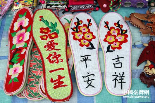 在攤位前,記者還發現了秀有“吉祥”、“平安”、“愛你一生”等字樣的鞋墊,羌家妹子說,繡上這些文字,既表達對地震中死難同胞的思念,也送出對震后生者的美好祝福。