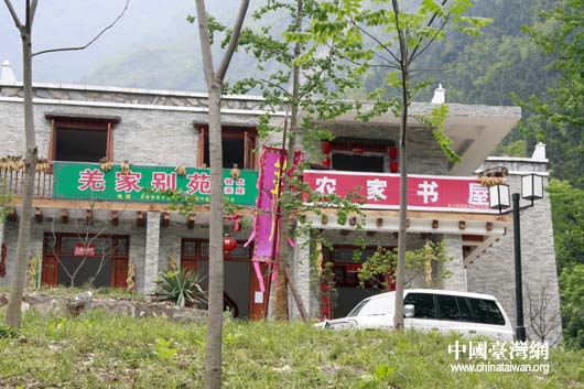“吉娜”羌寨里的農家做起旅游生意,打出招牌招攬游客。(中國臺灣網 鐘寶華 攝)