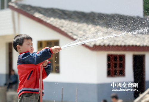 棗樹村,5歲的尚鑫波正在聚精會神地給自家正在修建的房屋澆水,讓鋼筋混凝土結構的房體保持濕度。他身后是已經投入使用的新民居。 (中國臺灣網 田云鵬 攝)
