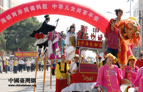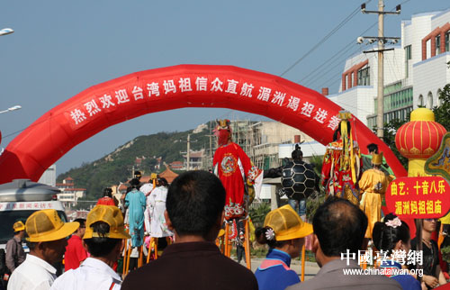 中國臺灣網5月15日莆田消息 臺灣媽祖信眾直航湄洲進香團今天下午抵達湄洲碼頭,湄洲當地民眾特意獻上精彩的民俗踩街表演,歡迎臺灣同胞的到來。(記者 張弛)
