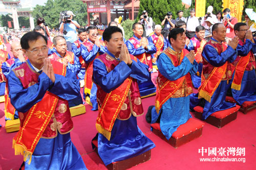 祭祀媽祖祈福大典在湄洲媽祖祖廟廣場舉行,圖為主祭人行三拜九叩之禮。(中國臺灣網記者 張弛 攝)
