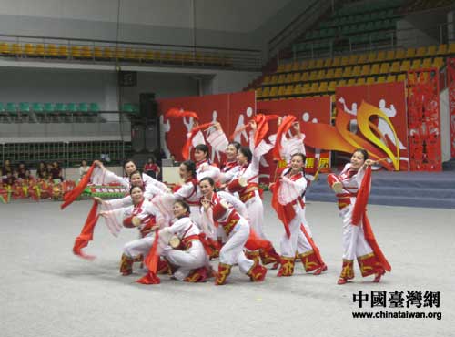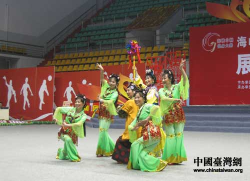海峽論壇·第三屆海峽巾幗健身大賽展示項目決賽今天晚上7點在泉州僑鄉體育館舉行。圖為三明隊表演健身胸鼓舞《紅紅的日子》(中國臺灣網發 蘭伯樂 攝)