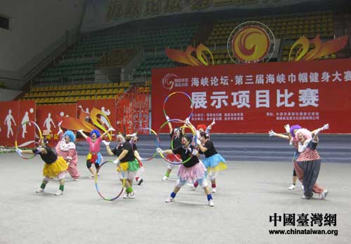 海峽論壇·第三屆海峽巾幗健身大賽展示項目決賽今天晚上7點在泉州僑鄉體育館舉行。圖為臺灣隊表演《呼拉圈舞》(中國臺灣網發 蘭伯樂 攝)
